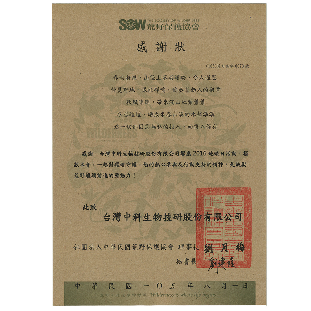 身為生技產業的一員,我們明白健康的生態是生命的源頭。早在 2016 年,我們就透過實質的捐款行動支持荒野保護協會,參與那場跨越四季的守護——無論是仲夏野地的蛙鳴,還是冬雪後山溪的流水,我們都深感榮幸能為這些自然美景的保存盡一份力。
