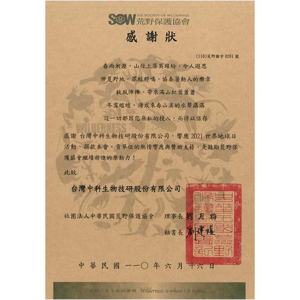 我們非常榮幸能參與「荒野保護協會」2021 世界地球日活動,並獲得這份深具意義的感謝狀。透過捐款支持,我們期盼能協助守護台灣的棲地,讓山徑的落英與野地的蛙鳴得以代代傳承。