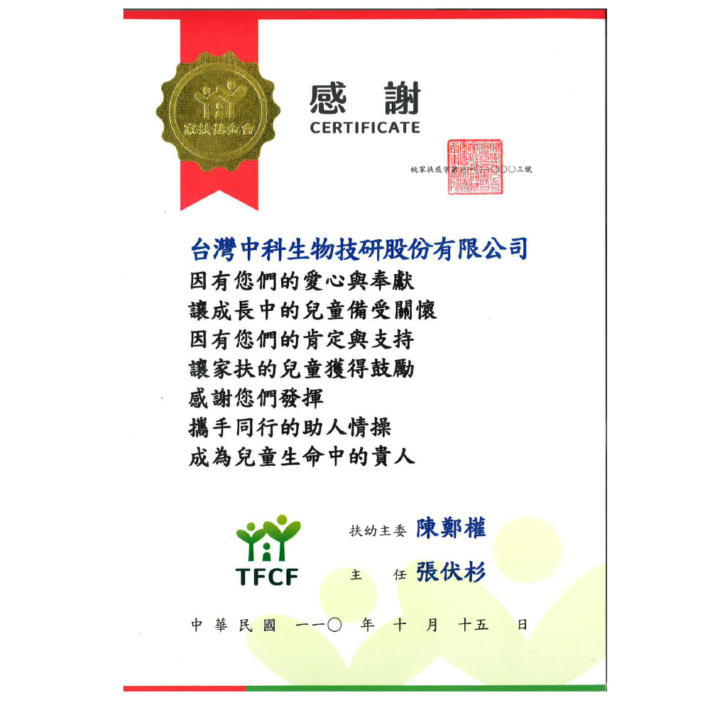 台灣中科生物技研始終相信,企業的價值除了科技研發,更在於能為社會帶來正向影響力。在 2021 年 10 月,我們很榮幸收到來自家扶基金會(TFCF)的感謝狀,這份榮譽紀錄了我們與家扶共同守護孩童的溫暖足跡。
