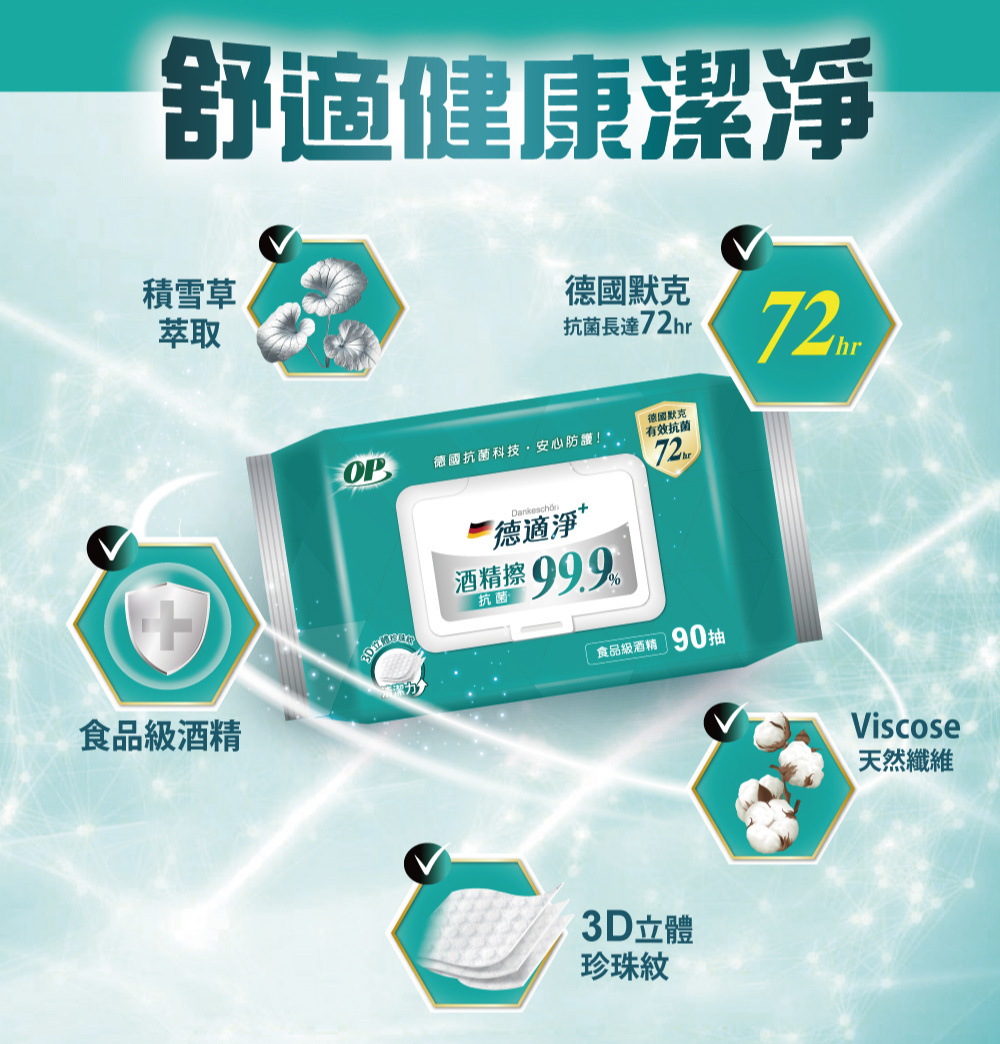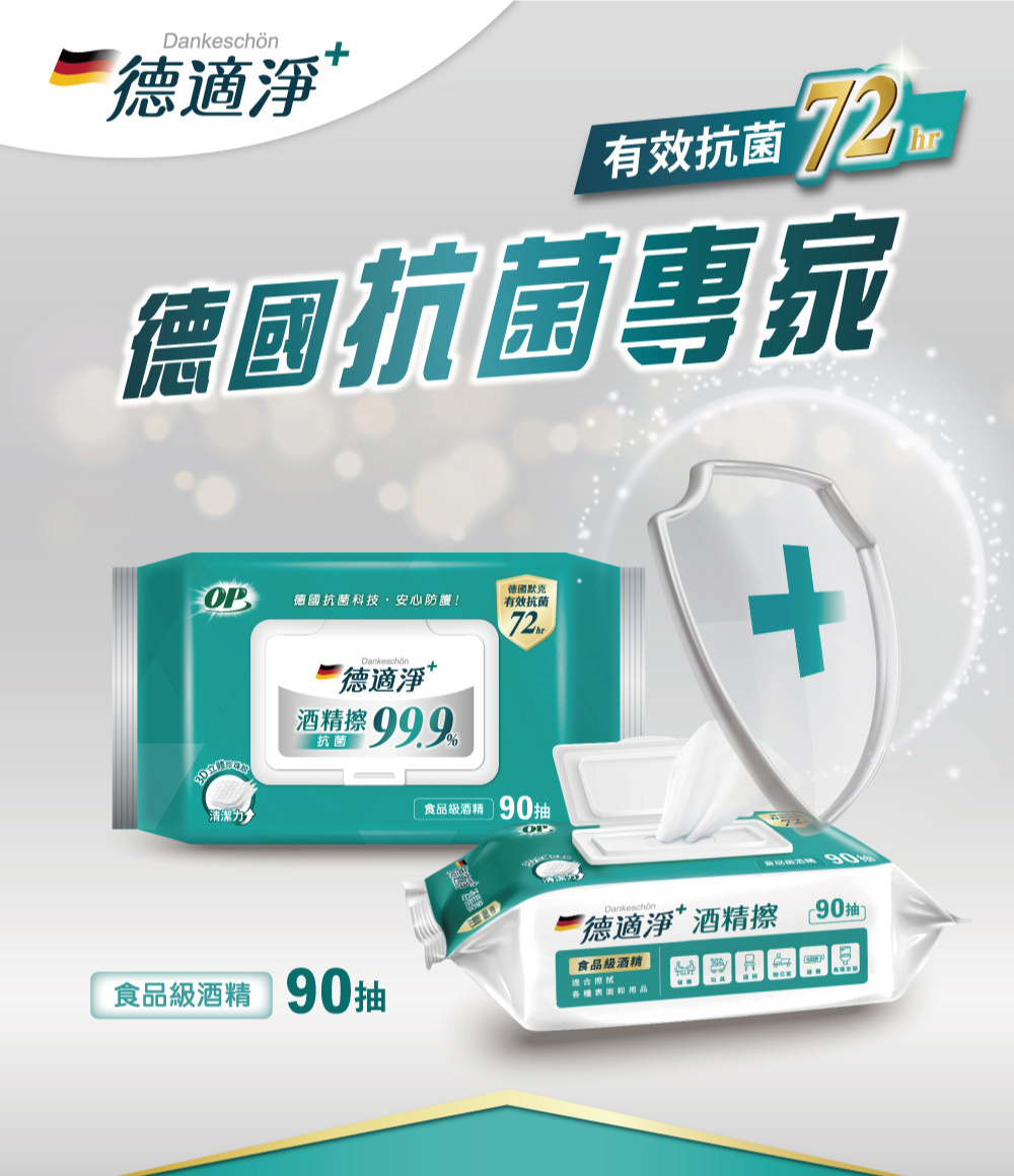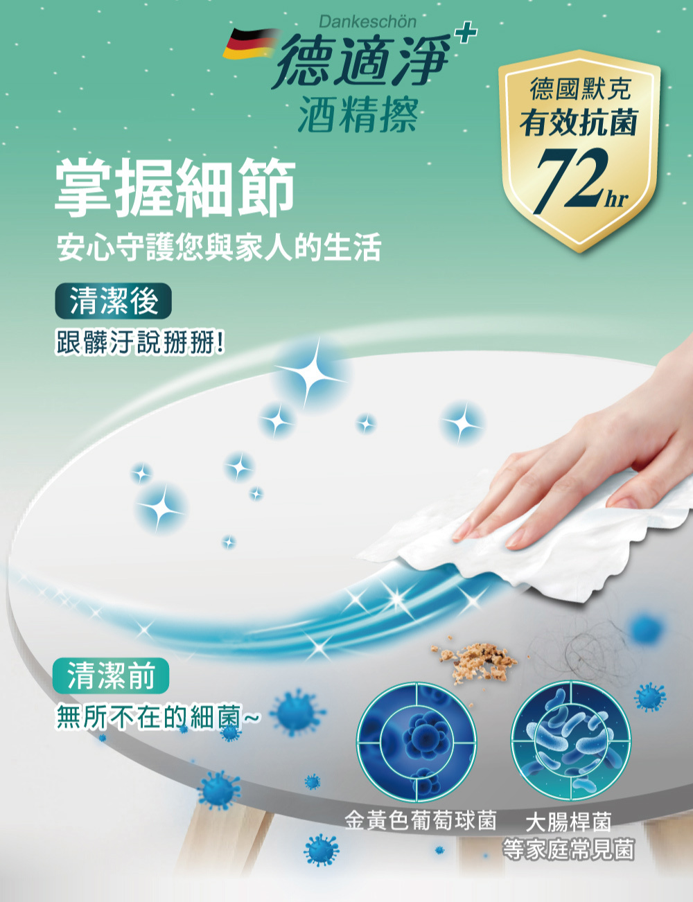德適淨+抗菌酒精擦,採用德國默克抗菌科技,隨時隨地,安心清潔: